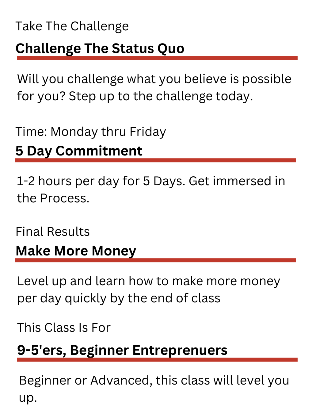5 DAYS PERFECTLY STRUCTURED WITH A PROVEN PROCESS TO GET YOU RESULTS.